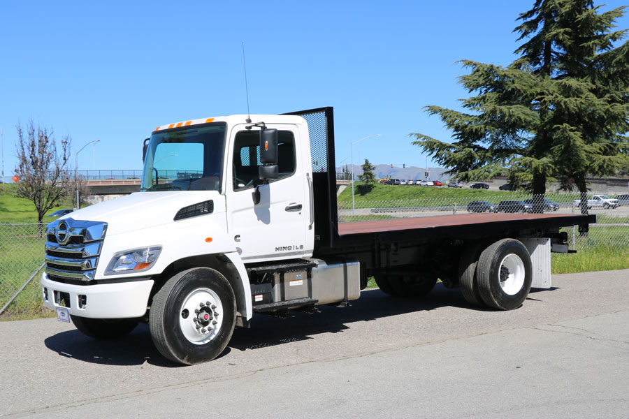 2025 Hino L6 26ft x 102"W Flatbed, Cummins 6.7B diesel, Allison transmission, air brakes, air ride suspension, power windows and locks, cruise control, power mirrors, air conditioning, reconditioned flatbed body and liftgate, steel headboard, wood deck, under mount tool box, ILP 2500 lbs capacity tuk away liftgate, GVWR 25,950